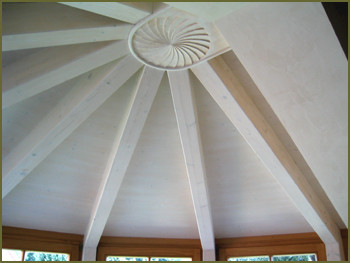 Knotenpunkt eines halben Kegeldaches mit weißer Untersicht.