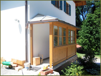 Zum Schutz vor Wind und Niederschlag wurde dieser Eingangsbereich aus einer Holzkonstruktion mit Dachverglasung geschaffen. Die Verglasungen im Dach und an der Seite bringen jetzt Schutz und gleichzeitig viel Helligkeit in den Eingangsbereich.